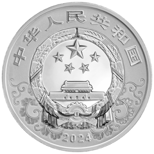 中華人民共和國國徽,襯以中國傳統吉祥紋飾,並刊國名、年號。